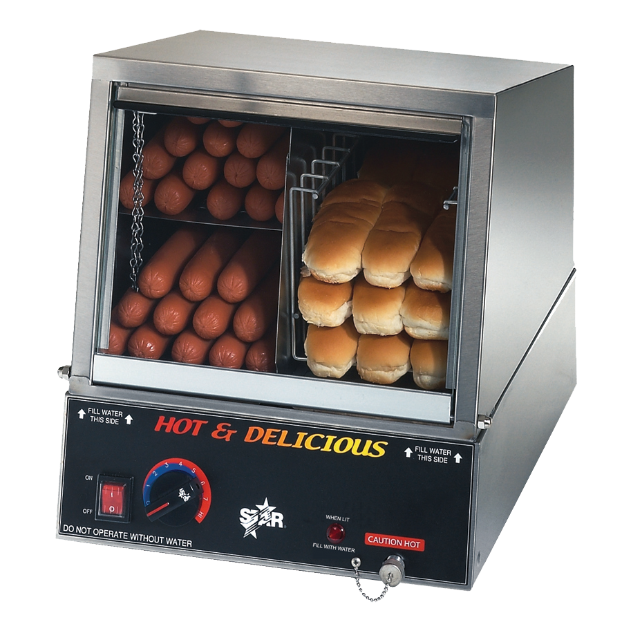 (QUICK-SHIP) Hot Dog Steamer with Juice Tray, side-by-side hot dog steamer/bun warmer, capacity (170) hot dogs & (18) buns, pull-down tempered glass doors, humidity controlled bun rack, large 11 quart water capacity, stainless steel construction, cULus, UL EPH Classified, Made in USA