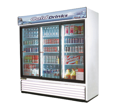 Refrigerated Merchandiser, three-section, 61.83 cu. ft., self-contained, WHITE cabinet exterior with white trim, standard depth, (3) double pane Low-E self-closing sliding glass doors, LED interior, LED advertising panel, energy conserving fan control, hot gas condensate system, (12) adjustable PE coated wire shelves, bottom mount compressor, R290 Hydrocarbon refrigerant, 1/2 HP, 115v/60/1-ph, 6.8 amps, cord, NEMA 5-15P, ETL-Sanitation, cETLus